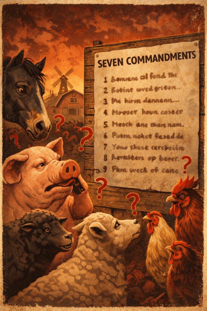The animals’ ignorance (It) in Animal Farm is another reason Napoleon’s power grew so quickly. At the beginning, the animals could hardly read, save for the pigs, who are the ruling class, and Benjamin the donkey. The lack of education plays to the pigs’ advantage because they erase and gradually rewrite the original rules of Animal Farm. No one could challenge the rules if they could not comprehend them. This ignorance allows Squealer to spread propaganda without challenge, which eventually solidifies into culture.